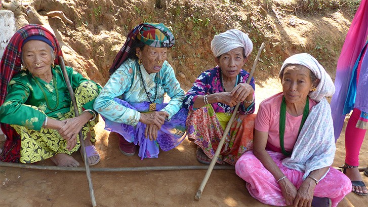 De fleste er klædt farverigt, men nogle neutralt. Vasketøj i alle nuancer hænger til tørre på tagene. Gederne bræger, der er en duft af traditionel madkultur, Dal Bhat fra det åbne køkken. Grønsags-karry med spinat, blomkål, linsesuppe, kogt ris, kylling og fladbrød. Lokalt dyrket lige udenfor. Ungerne har fået fri fra skolen, de er nysgerrige, glade og leger. Mange har ikke mødt mennesker, der ligner os før.