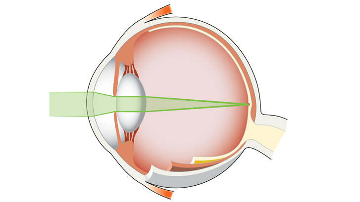 For at forklare hvorfor en synsfejl opstår, vil vi først forklare, hvad der sker inde i et øje med normalt syn. Alt, du ser, er lys i forskellige bølgelængder, og når disse lysstråler når frem til øjet, skal de brydes ved hjælp af øjets lysbrydende dele, disse er primært hornhinden og øjet naturlige linse. Lysstrålerne skal derefter mødes og fokuseres på ét og samme punkt på nethinden bagerst i øjet. Dette punkt kaldes den gule plet (makula), og det er her synsskarpheden opstår.